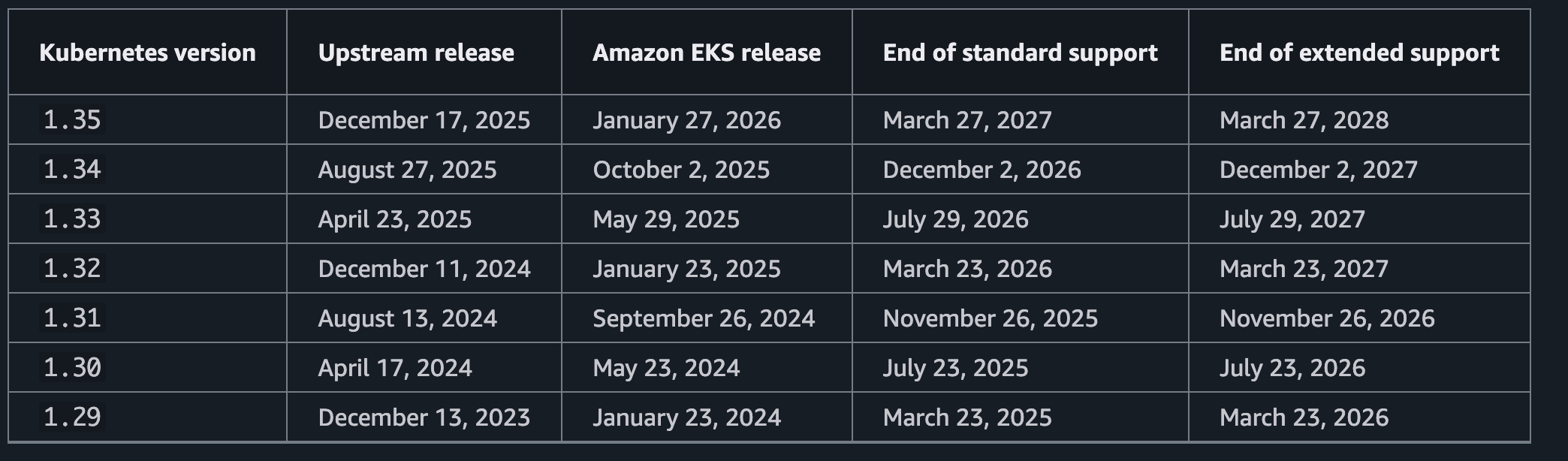 - AWS官方文档: Amazon EKS Kubernetes versions